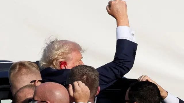 Presidential candidate, Donald Trump, after being hit by the shooter